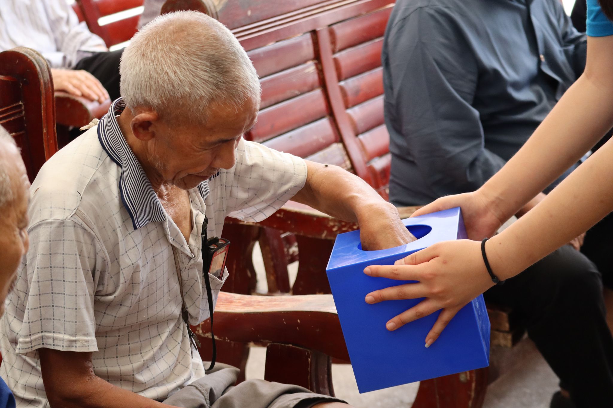 活动尾声,实践团还准备了别出心裁的抽奖环节,为老人们送上精心挑选的慰问礼品。抽奖盒里藏着的“小惊喜”——肥皂、抽纸、洗衣液,每一件都是同学们结合老人日常所需精心挑选的,凝结着满满的心意。当老人们依次从盒中抽出写有礼品名称的纸条时,脸上的笑容里盛满了惊喜与满足,那一张张灿烂的笑脸,成为这个夏日里最动人的风景。