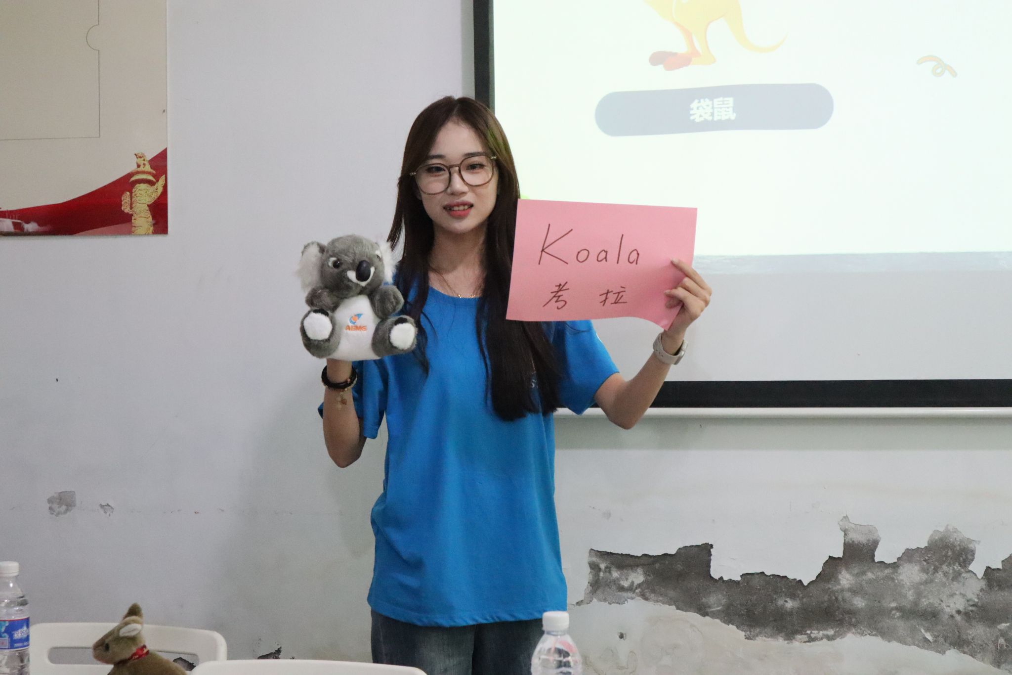随后,实践团成员化身“知识向导”:在世界地图上圈出澳大利亚的位置,对比重庆北碚的经纬度,让孩子们直观感受“遥远”的含义;举起袋鼠、考拉毛绒玩具,教孩子们认读“kangaroo”“koala”等英文单词。“动物猜猜猜”游戏更点燃全场——“是袋鼠!它有育儿袋!”孩子们踊跃抢答,答对时的欢呼与掌声此起彼伏,汇成最动听的课堂旋律。