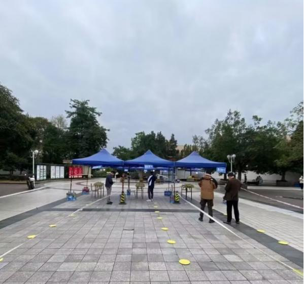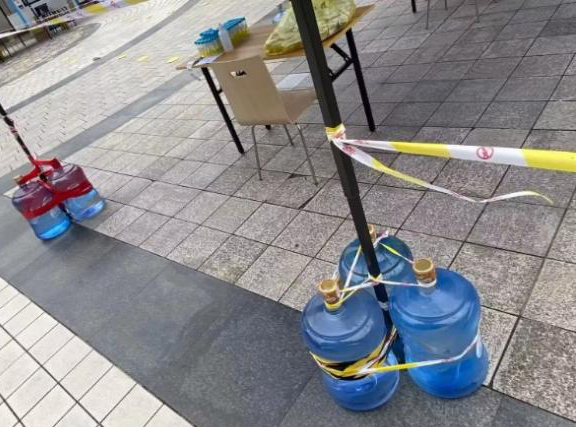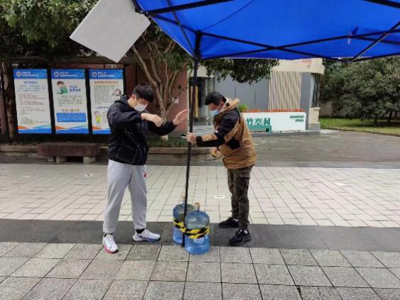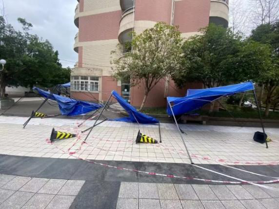 11月11日晚至12日早上,一场暴雨将竹园二区核酸采样点几乎所有的帐篷刮倒在地,一部分甚至损坏不能使用。据他回忆,当时风太大,帐篷根本稳定不住,在学院党委滕超副书记的带领下,他们就地取材,搬了20余桶桶装水固定帐篷,并配合剪刀、胶带、螺丝刀等工具……最终在当前核酸采样时间前成功修复核酸采样点。