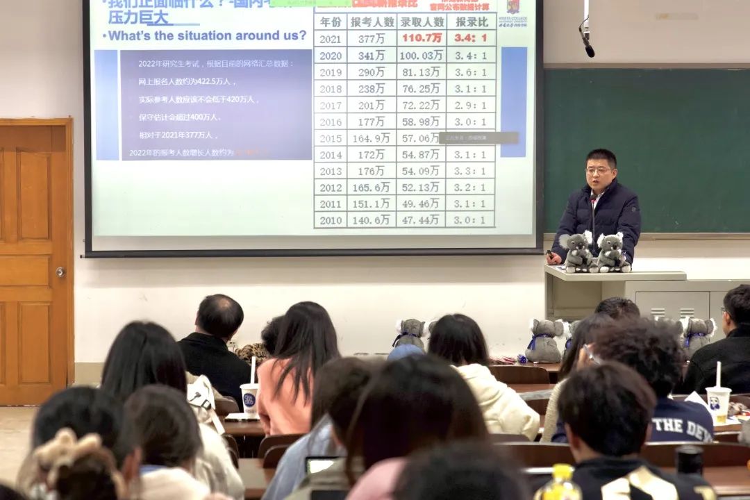 滕超副书记从学院办学定位、国家教育对外开放战略、国内考研就业形势、培养模式和学院两届毕业生就业数据等方面为同学们梳理了中外合作办学项目的优势。