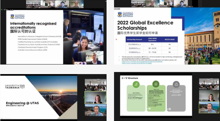 西澳大学商学院副院长Nicholas Letch教授和分子科学学院国际项目协调员Alyssa Van Dreumel博士,塔斯马尼亚大学工程学院全球事务副主任Sarah Lyden女士、国际合作官员Kamal Shahril先生、招生市场中国区主任Candy Han女士分别从两所合作高校所处的城市环境、学校国际声誉、全球合作、培养模式、授课方式、学生活动等方面进行了介绍,重点讲解了澳大利亚最新的入境政策,并欢迎同学们未来亲自前往海外学习生活。