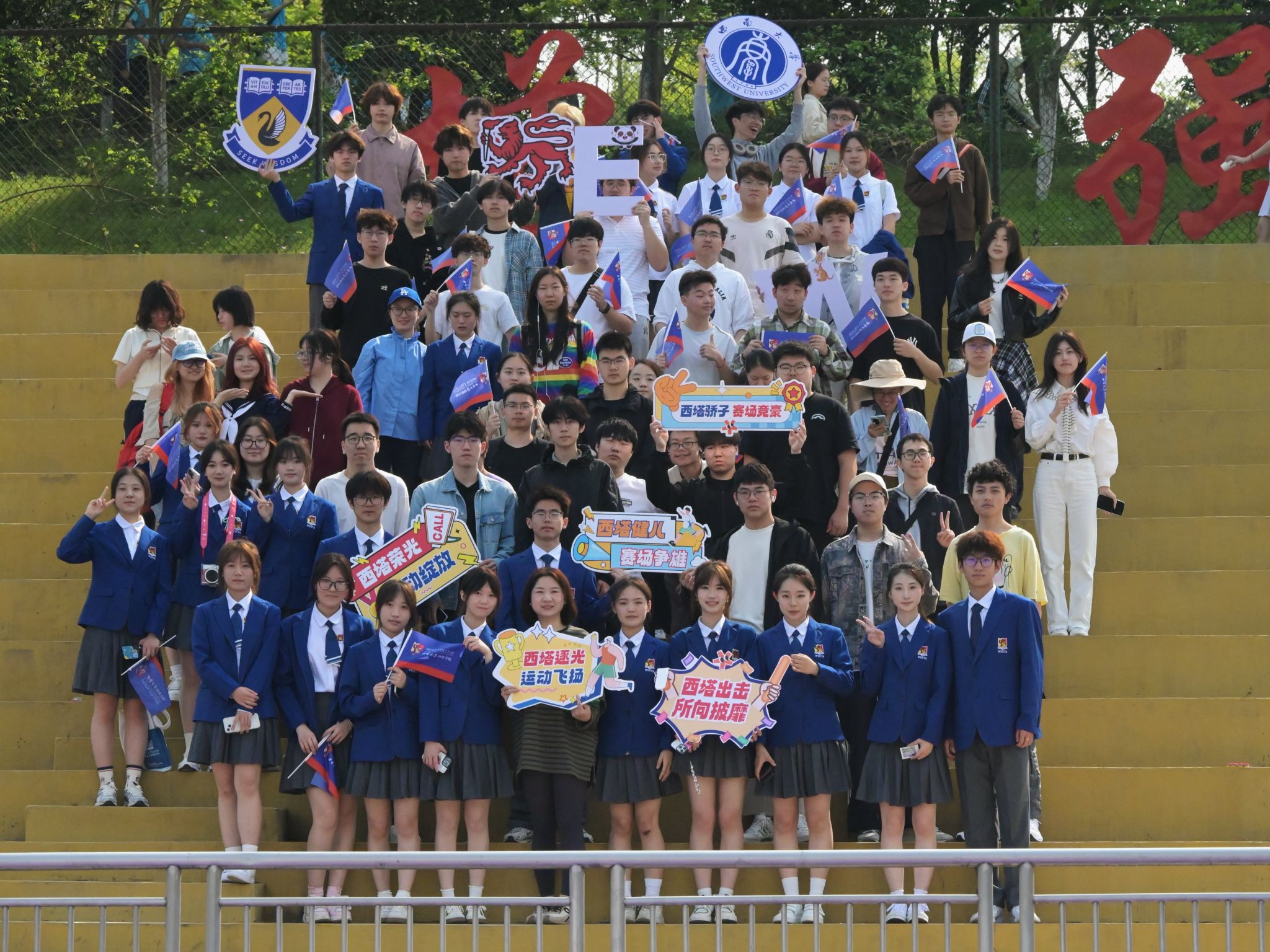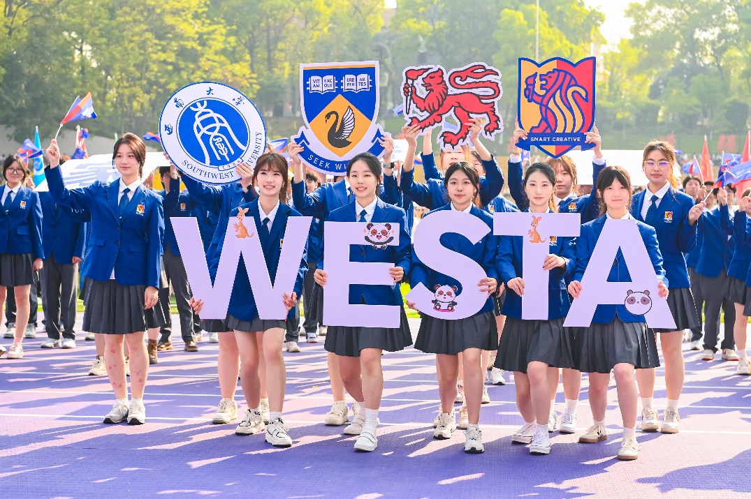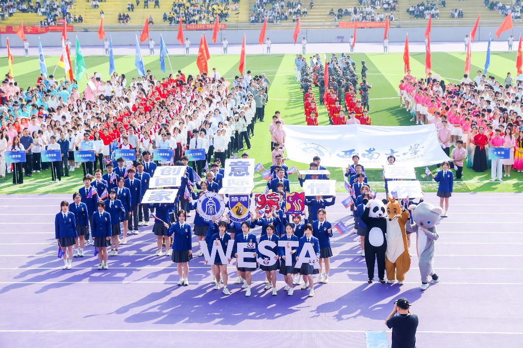 行进过程中,“西塔新青年,中西学并兼;心向寰宇阔,报国意志坚”的口号声如洪钟般响彻全场,这激昂的口号,展现出西塔学子坚定的信念与豪迈的气魄。由“家国情怀”“国际视野”“创意精英”以及三校校徽组成的主题方阵,队列整齐有序,彰显出西塔学子多元的风采与蓬勃的朝气。他们身着大方得体的院服,脸上洋溢着自信的神情,成为运动会开幕式上一道亮丽的风景线,赢得现场观众的阵阵掌声。