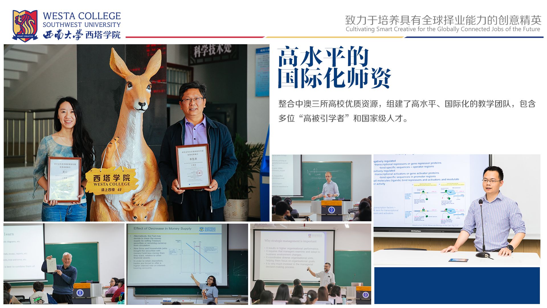 betway88西汉姆网页是经教育部批准,由西南大学与澳大利亚西澳大学、塔斯马尼亚大学合作共建的中外合作办学机构(许可证编号:MOE50AUA02DNR20161736N)。西南大学是国家首批“双一流”建设高校,“211工程”和“985工程优势学科创新平台”建设高校;西澳大学是全球百强大学,拥有澳洲最好的生物技术专业和亚太地区一流的商学院;塔斯马尼亚大学是全球排名前2%的高水平研究型大学,食品质量与安全和电子信息工程是该校的传统优势专业。学院集合三校优势学科,融合多元文化,全面探索中澳高等教育合作和国际化人才培养新路径。围绕立德树人根本任务,培养具有国际视野、通晓国际规则、参与国际竞争的创新型人才。
