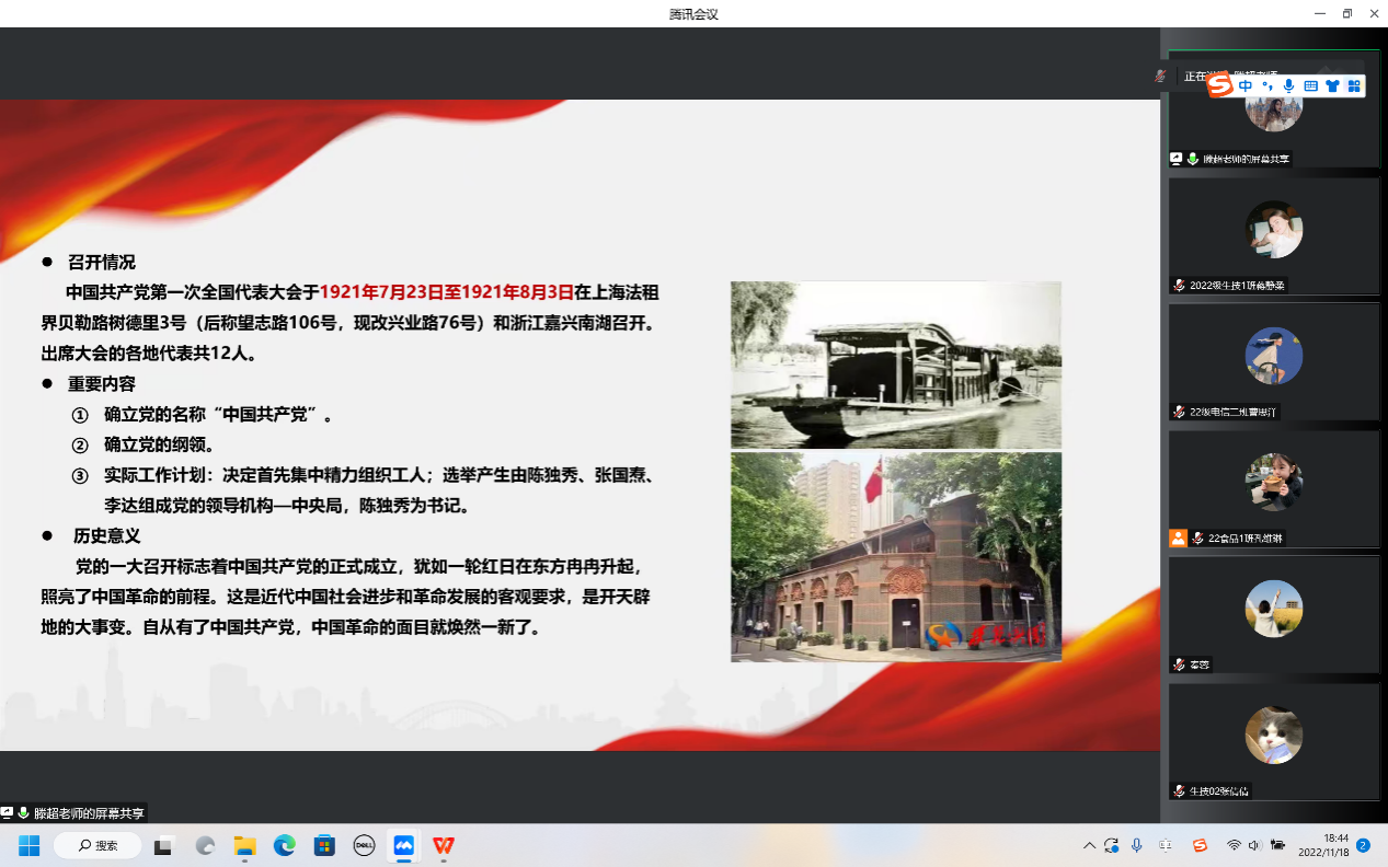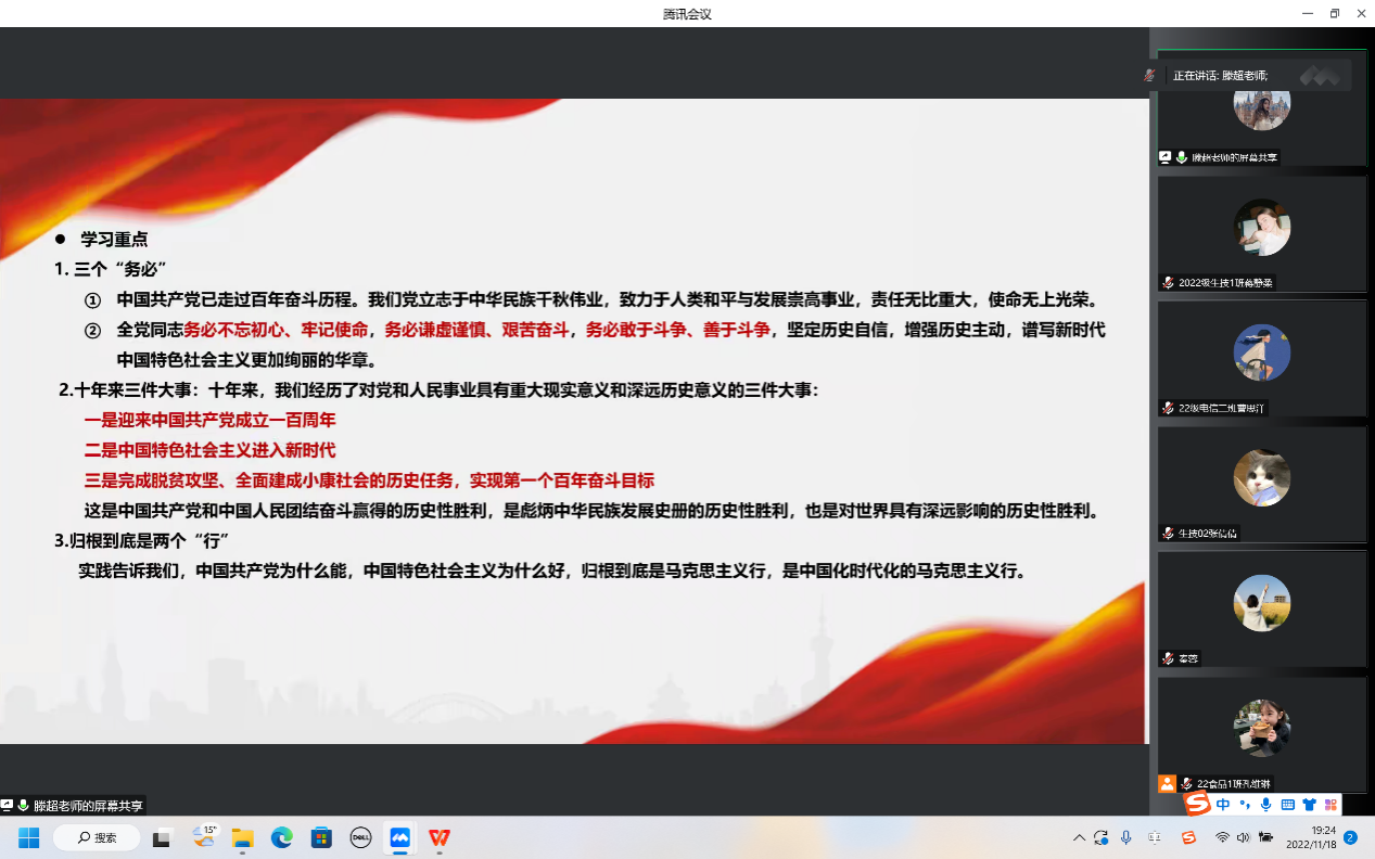 11月18日晚,betway88西汉姆网页党委副书记、纪委书记滕超为第七期入党积极分子暨第四期大学生骨干培训班线上讲授“党的一大到二十大的光辉历程”主题党课。学院正科级组织员秦蓉和全体培训班学员线上认真聆听。