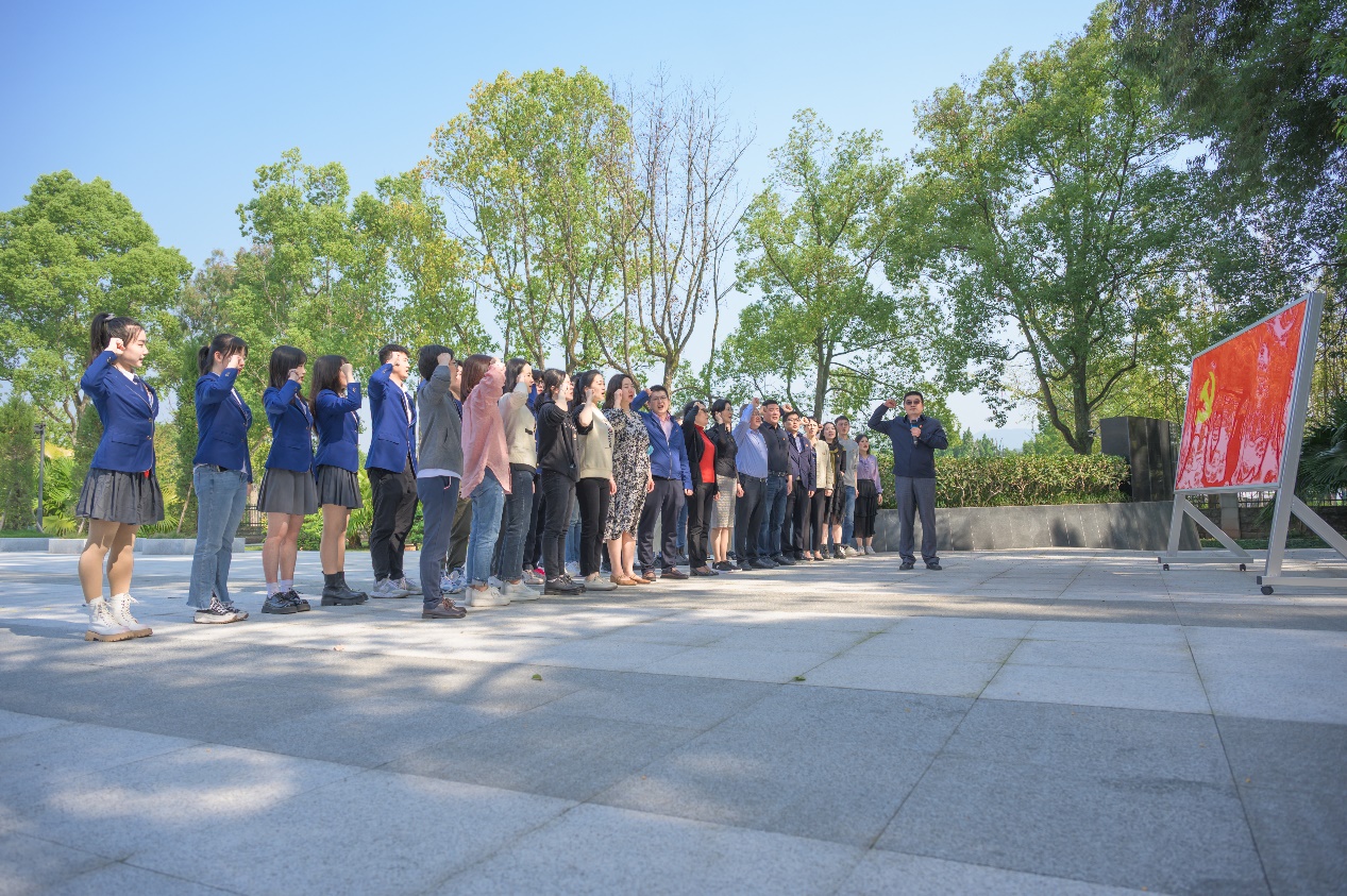 师生一行在静观镇参观王朴烈士陵园红色基地,王朴中学师生志愿者们深情地讲解了烈士的英雄事迹。大家认真聆听,缅怀英雄先烈,接受革命精神洗礼。学院党委书记王静同志带领到场师生在王朴烈士墓碑前默哀鞠躬,并依次为英烈敬献鲜花,表达对英烈的崇敬与追思。面对鲜红的党旗,学院党委组织委员、副院长张俊同志庄严领誓,大家一起重温入党誓词,进一步增强理想信念。