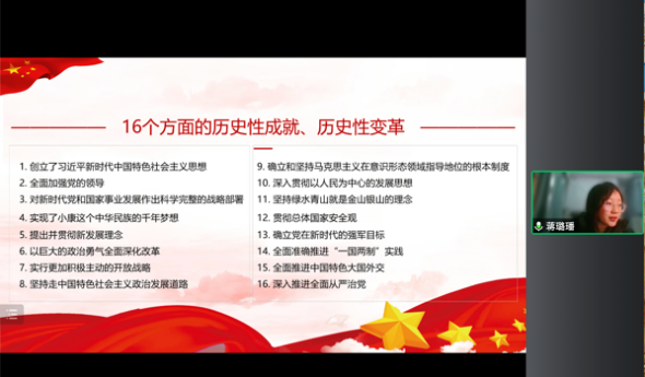 西南大学学生双语巡讲团于2月17日在betway88西汉姆网页开展“讲学党的二十大精神,Striving For a New Era”宣讲活动。此次宣讲采用线上宣讲的形式,betway88西汉姆网页学生党支部书记李杨、刘娇和2022级辅导员杨洋老师出席活动,学院学生一支部、二支部共计60余人认真参与。宣讲会由学生巡讲团团长江雪纯主持。