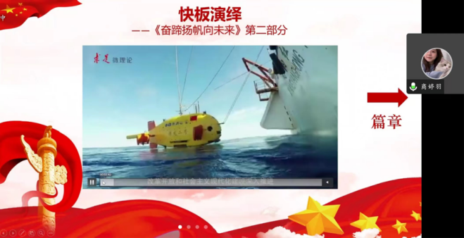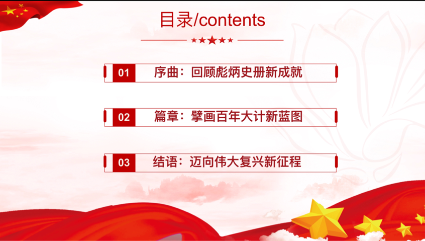 宣讲活动以“序曲”、“篇章”、“结语”三部分展开,每个版块既相对独立,又有机统一。“序曲”部分以“回顾彪炳史册新成就”为主题,带领师生回顾了新时代十年的伟大变革和辉煌成就。“篇章”部分以“擎画百年大计新蓝图”为主题,向大家展示了国家实现民族复兴新篇章的大政方针及其让中国特色社会主义展现出的强大生命力。“结语”部分以“迈向伟大复兴新征程”为主题,宣讲团成员用坚定的口号“Unity is strength ,and only in unity can we succeed”来续写华丽篇章,以顽强的信念“A nation will prosper only when its young people thrive”来展现青春担当。
