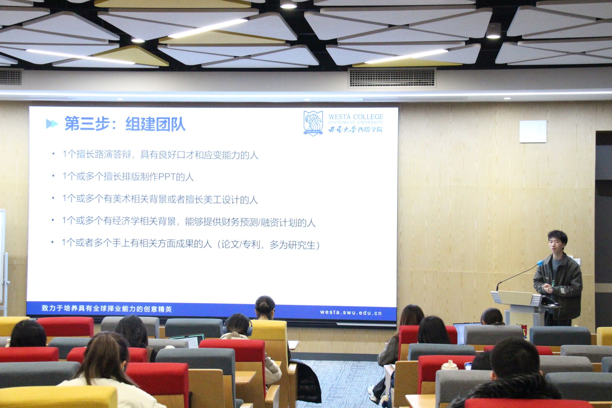团队负责人李卓俞首先为大家分享了“如何开启一个项目”的经验。他简要介绍了自己的团队成员构成和组建背景,分享了团队先后荣获西南大学2024年“含弘杯”铜奖和2024年中国国际大学生创新大赛重庆赛区金奖的获奖经历。李卓俞从寻找导师、确定项目、组建团队三个方面详细介绍了作为负责人启动项目和推动项目的详细过程。