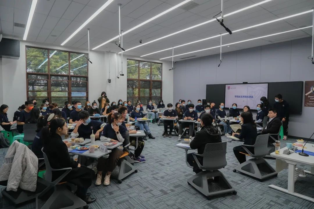 首先,赵玉芳院长利用生动风趣的语言,围绕着“大学生活意义”和“如何做好学术科研” 为学生答疑解惑。她重点分享了海外留学生活经历,展现了中外文化差异,深度解析了中外合作办学人才培养的内涵,以FPP项目(新生科研计划)成果为例,提出了语言能力、国际视野和大胆尝试是西塔学子所需要具备的基本素质。此外,她指出大学生活的“三用”:一用好图书馆;二用好实验室;三用好老师。最后,她介绍了学院为培养具有全球择业能力的创意精英系列举措。