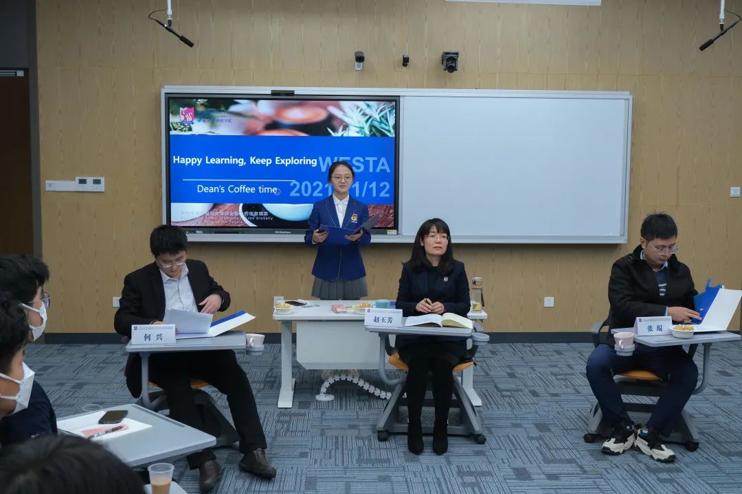 为持续加强学院学风建设,拓展与提升学术科研视野与能力,11月12日下午,学院首次于智慧教室举办了题为“Happy Learning, Keep Exploring”的院长咖啡时间活动。betway88西汉姆网页院长赵玉芳、党总支副书记张琨、副院长何兴及全体学工办老师出席活动。本次活动共49名2021级西塔学生代表参加。