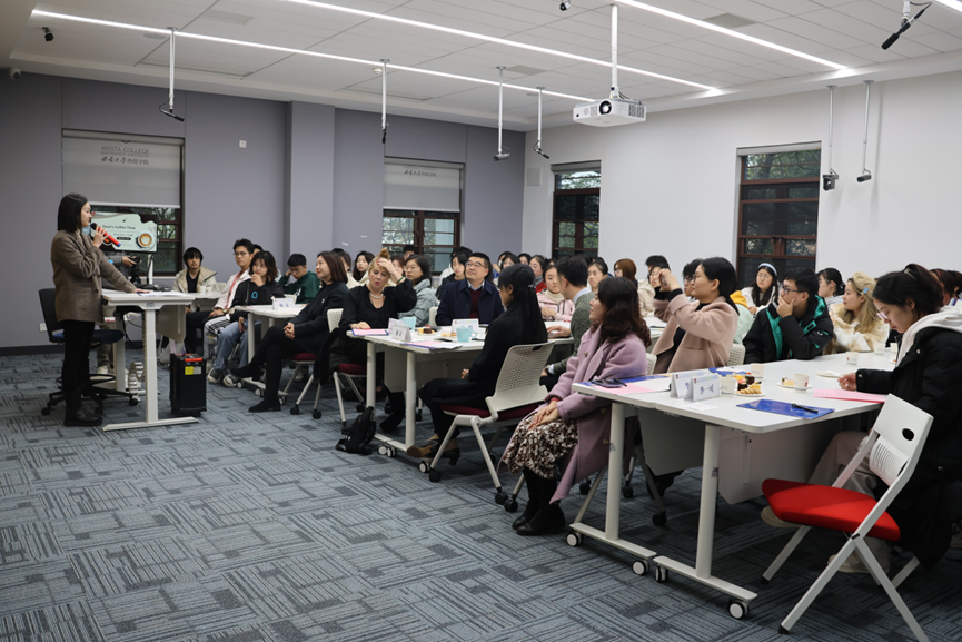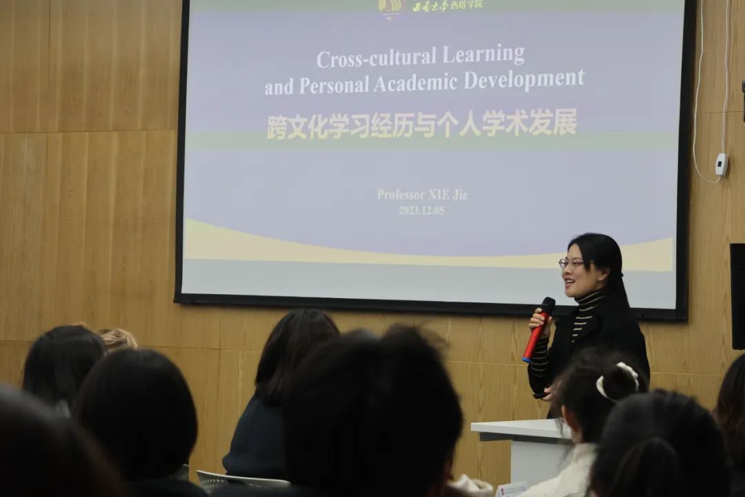 谢洁院长从“Who are we?”提问出发,用生动形象的图片与案例启发同学们对跨文化的思考与理解。她以自己赴美做访问学者期间的经历为例,从个人学术成长、跨文化学习与交流能力、批判创新思维养成等多角度向学子们阐明了开展多元文化交流和学习的重要性。最后,她通过介绍学院为培养具有全球择业能力的创意精英系列举措,鼓励学子们要不断挑战和突破自我,实现从西塔走向世界舞台的飞跃。